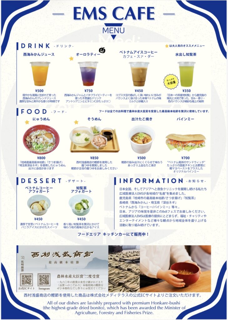 鹿児島県枕崎市の最高級本枯節でとった本格だしを使用したそうめんや出汁たこ焼き、西海みかんジュース、本場ベトナム仕込みのバインミーとコーヒーなど多彩な味覚が勢ぞろいです。